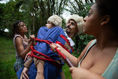 Duas atrizes negras são interceptadas pelos guardas da corte no momento em que começariam uma apresentação. Tem início uma perseguição. As cordas vermelhas são as linhas que costuram a dramaturgia do espetáculo, que mistura técnicas de dança, teatro e circo.